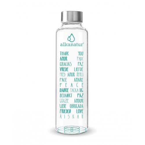 Garrafa de cristal borossilicato reutilizável ideal para que possa levar água alcalina ou outras bebidas consigo a qualquer parte.